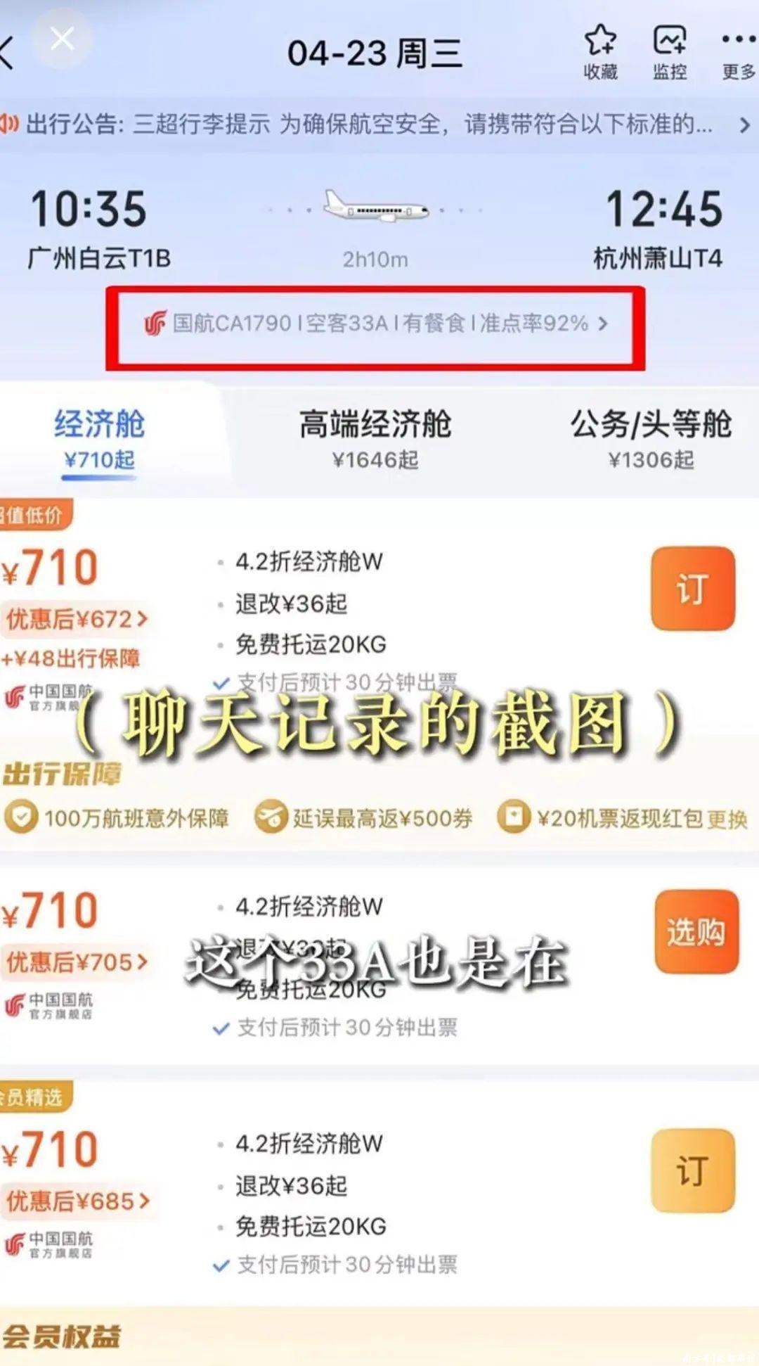 来自广东的罗先生向南都记者反映称,其于4月14日购买了4月23日从广州前往杭州的国航CA1790航班商务舱。“当时买票我们就首选了大机型,大飞机平稳而且坐着舒服一点。我们截图了订票页面,显示执飞机型是空客33A。但直到我们当天上机才知道,机型换成了小飞机A321,航司也没给解释。”