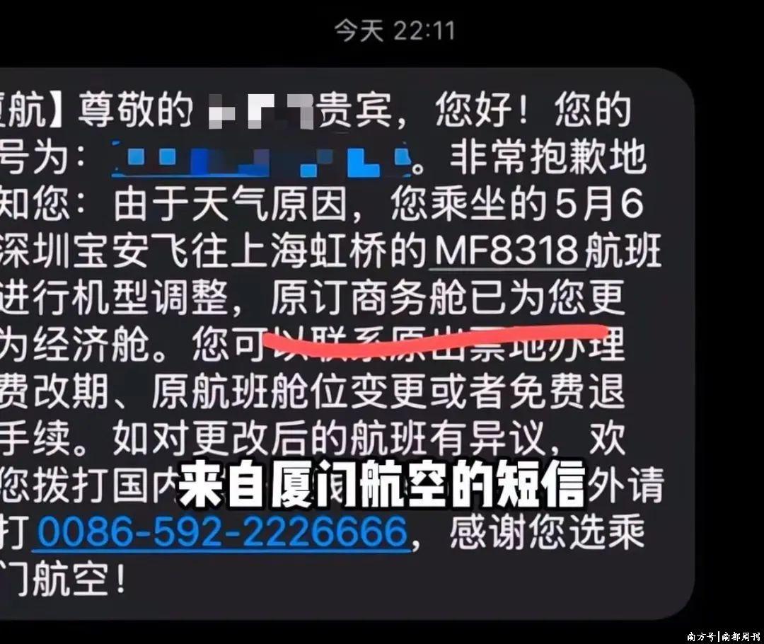 近日,有博主发布视频称,其原计划于5月6日,乘坐由深圳宝安飞往上海虹桥的厦门航空MF8318航班商务舱,“却遭遇免费降舱”。